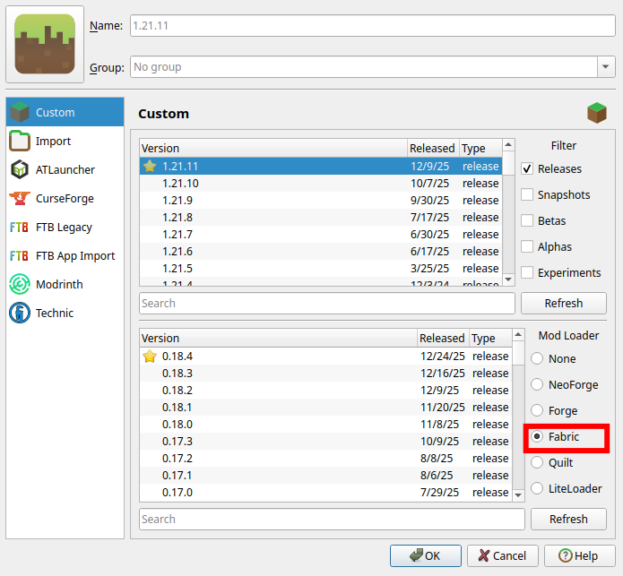 - Choose the latest version with the "Fabric" mod loader